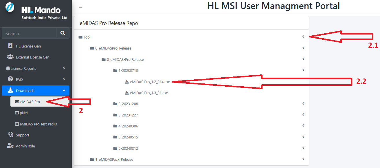Click on arrow number 2 to expand the folders. Inside the folder, you will find the downloads link, which is indicated by arrow number 2.2.